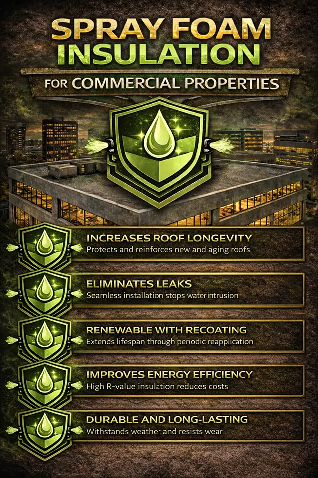One of the biggest advantages of spray foam roofing is its seamless nature. Because it is fluid-applied, there are no seams where leaks commonly develop. This makes SPF one of the most effective solutions for stopping and preventing water intrusion on low-slope and complex commercial roofs.