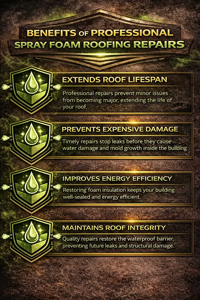 Spray foam roofing repairs are only as good as the materials and workmanship behind them. High-quality coatings protect the foam from UV exposure and environmental wear. If inferior products are used, the repaired area can deteriorate quickly, leading to repeated repairs and higher long-term costs.